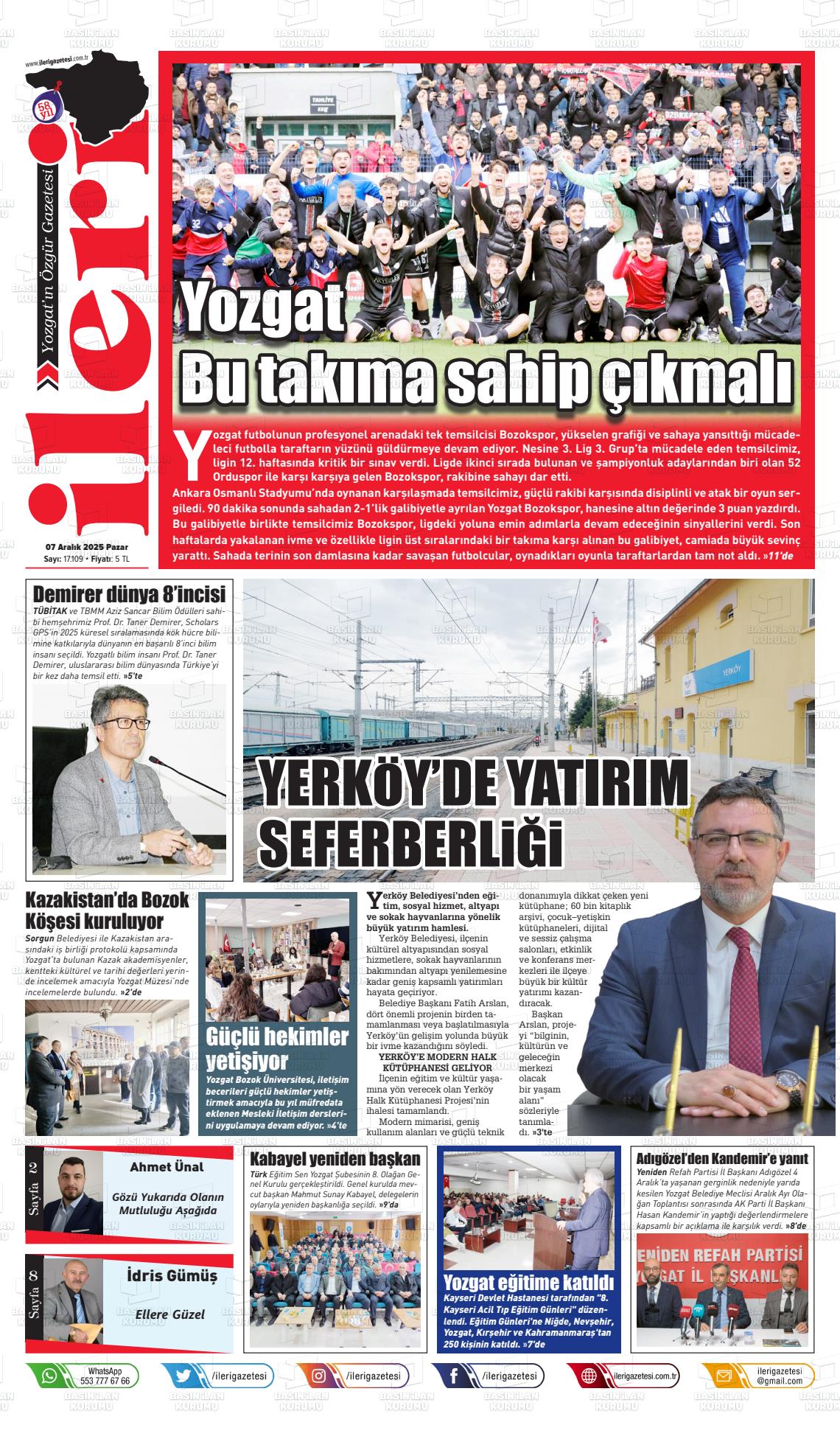 Yozgat Yerel Gazeteleri 07 Aralık 2025, Pazar Günü Manşeti